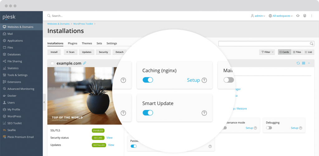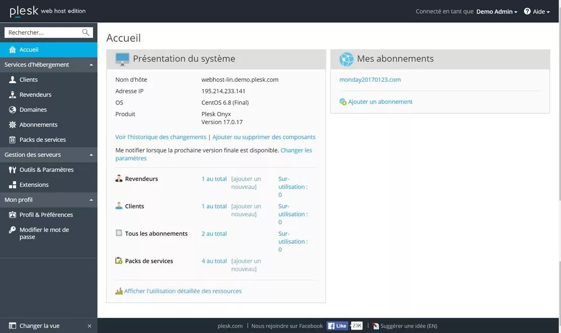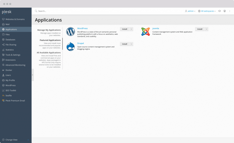 Desde la interfaz de Plesk Obsidian podrás administrar tu servidor. Con solo unos pocos clics, puedes administrar libremente tus direcciones de correo electrónico y tus sitios web. Puedes agregar, modificar e incluso eliminar archivos o instalar aplicaciones que proporcionarán a tu sitio web funcionalidades avanzadas para tus usuarios en Internet. Con la interfaz de Plesk Onyx, toma el control de tu servidor en la nube o servidor dedicado desde un entorno ergonómico, intuitiva y potente. Plesk es uno de los más potentes entornos web para servidores VPS, Cloud o Servidores dedicados.
